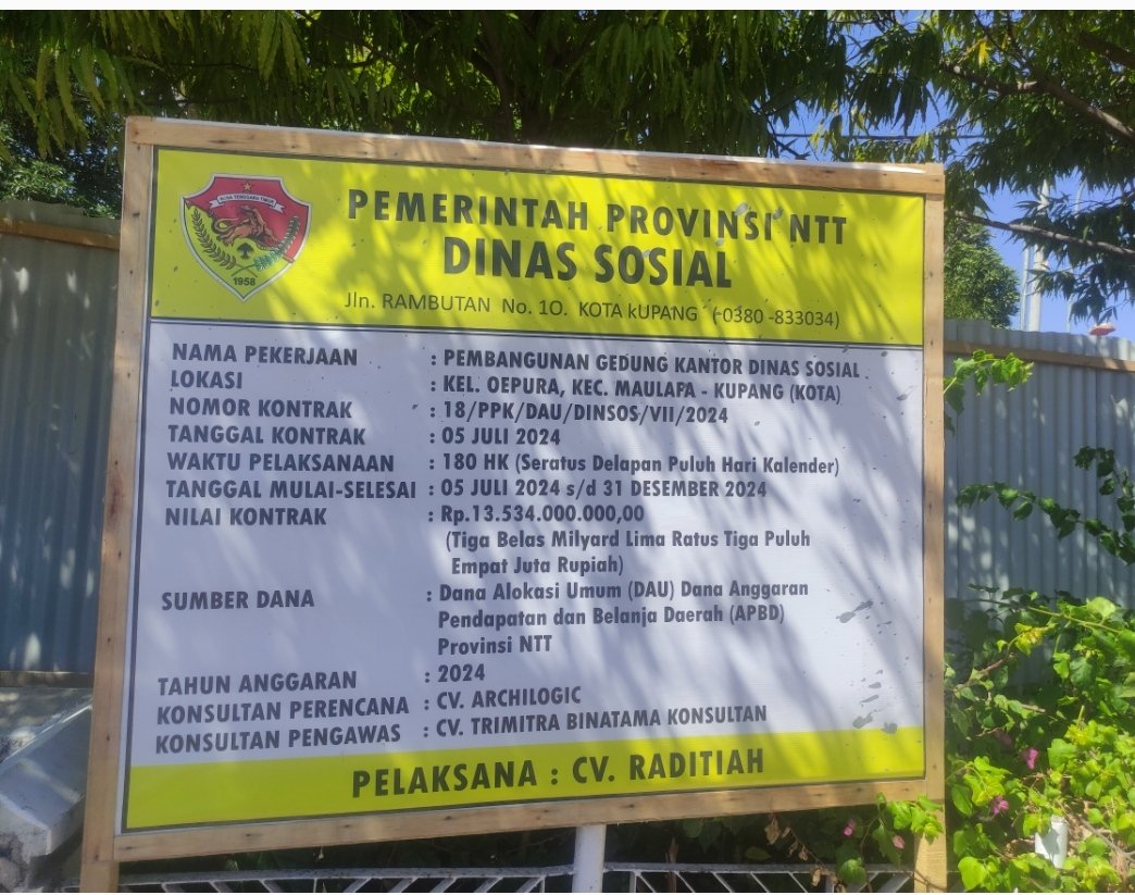 Kupang, suluhdes.com – Pembangunan gedung kantor Dinas Sosial Provinsi Nusa Tenggara Timur (NTT) di Kupang mengalami keterlambatan. Hal ini diungkapkan oleh Pejabat Pelaksana Kegiatan (PPK) kantor Dinas Sosial, Okto Tena, dan dikonfirmasi oleh Kepala Dinas Sosial NTT, Kanisius Mau.