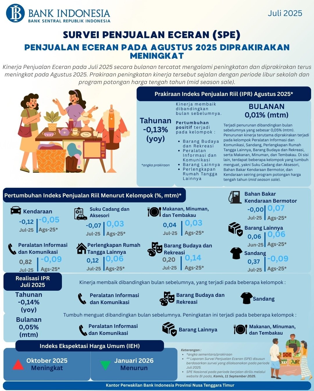 Sebagai catatan, Laporan Survei Penjualan Eceran (SPE) Kota Kupang disusun berdasarkan survei kepada 75 responden yang dilaksanakan pada periode Juli 2025. SPE Nasional pada periode berjalan dirilis melalui website BI pada Kamis, 11 September 2025.***